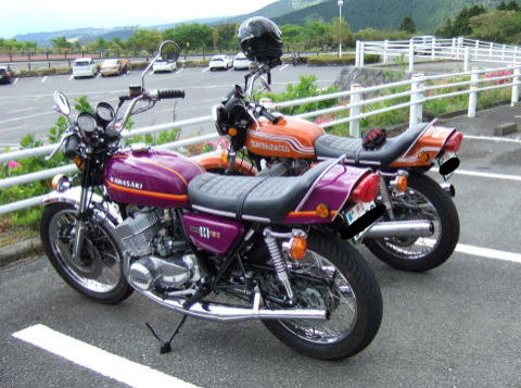 場外には2台のカワサキマッハV750(2サイクル3気筒)が。