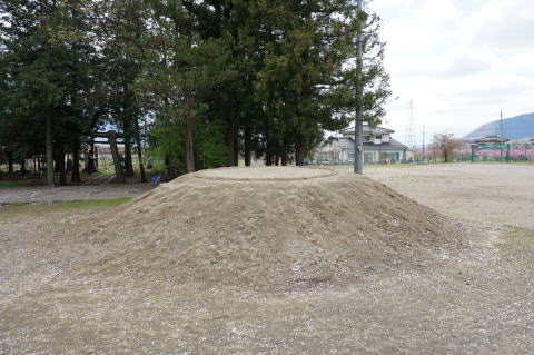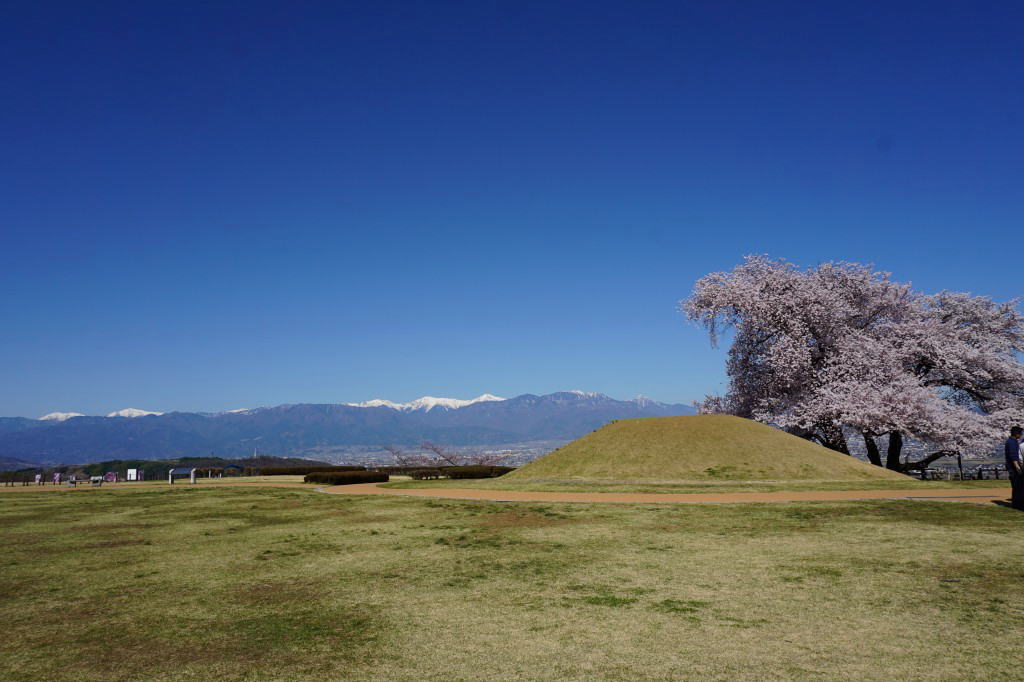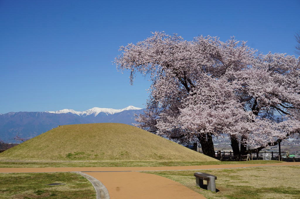 笛吹市 盃塚古墳の満開の桜と白根三山