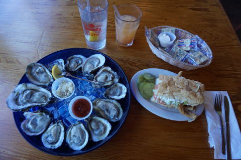 オイスターオンザハーフシェルとポボーイサンドウィッチ。