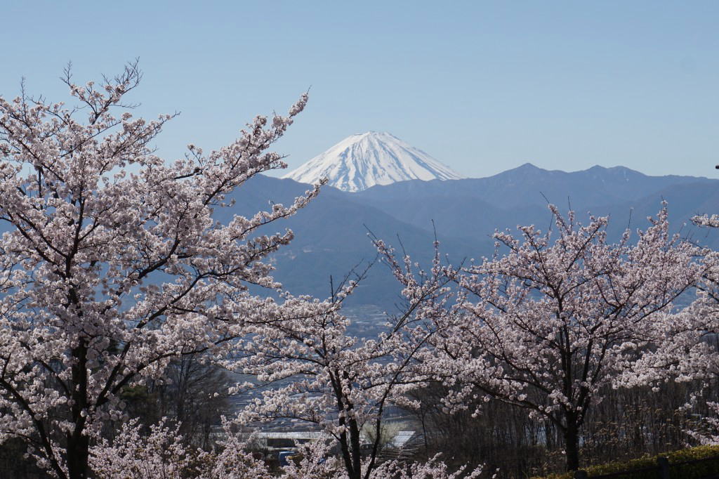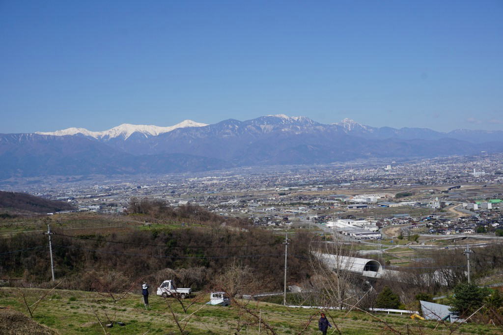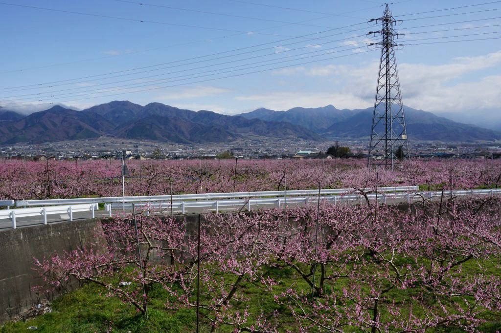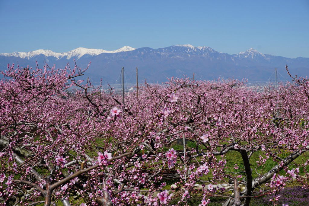 快晴の南アルプスと桜、心洗われる景色だナ。