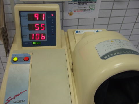 ロビーで血圧を測ってみるとこんな感じ。(高、低、拍)
