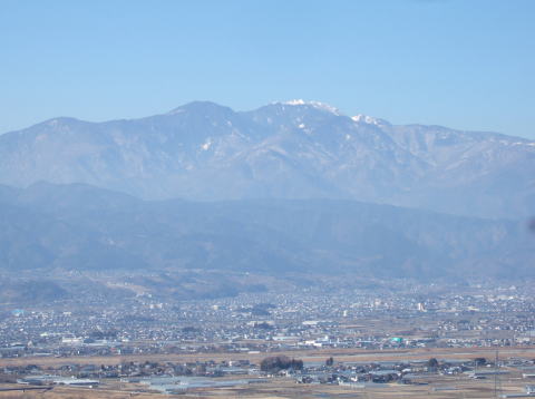 笛吹川の向こうには甲府、その向こうには金峰山、国師ヶ岳、等々の奥秩父の山々。