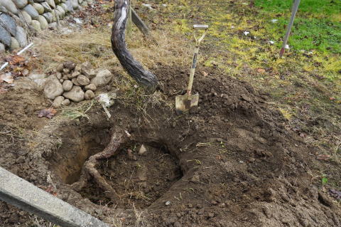 50cm程だった苗木は1年で3m程に成長し、根も伸びているが、場所替えをするもの。