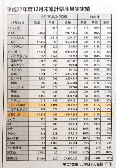 昨年度平成27年(2015年)山梨県産果実販売高が『果実山梨』(発行:全農山梨)に載っていた。