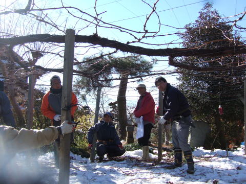1週間前の雪が残る寒波の中、朝9時開始、標高400mのブドウ園はチョー寒かった。
