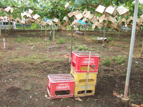 青袋が破られ落ちていて、ぶどう数粒が食われていた。