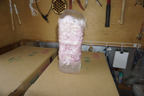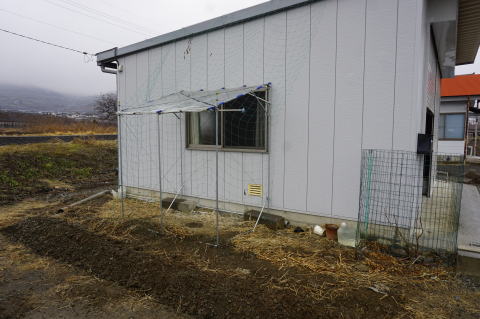 2/24 ビニールを張ってみたところ、骨組みの間隔が広すぎて雨水が溜まってしまいそうなので、