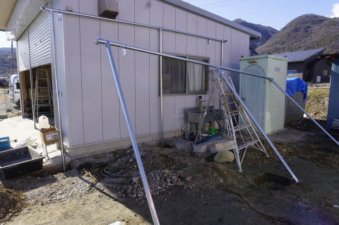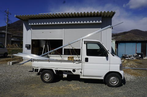 後は屋根にビニールを張れば、巾2.5m、長さ4.5m、高さ2.1mの”本格的”屋根付駐車場が完成する。