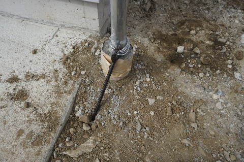 屋根が風で飛ばされないように、支柱の基礎にアンカーを4ヶ所打つ。