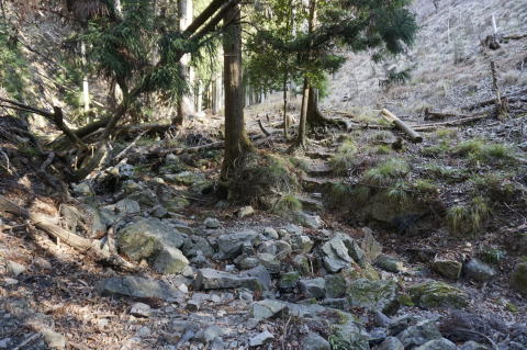 こういう場所は落葉があってその下に石があるから歩きにくい。
