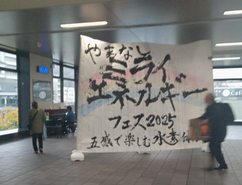 3/15 甲府駅へ行くと、水素エネルギーのフェスの看板が