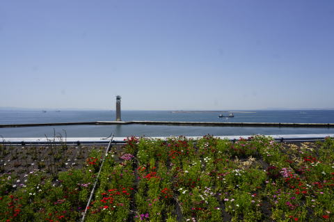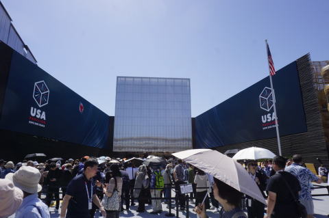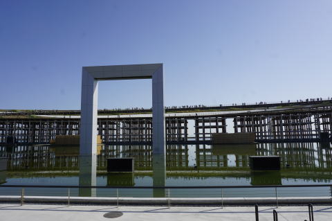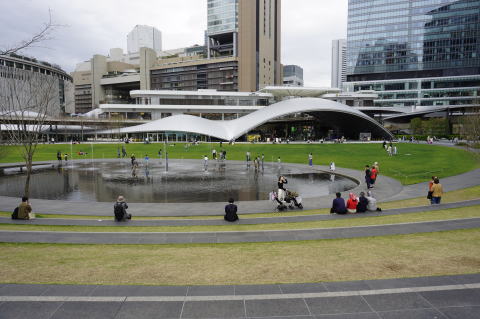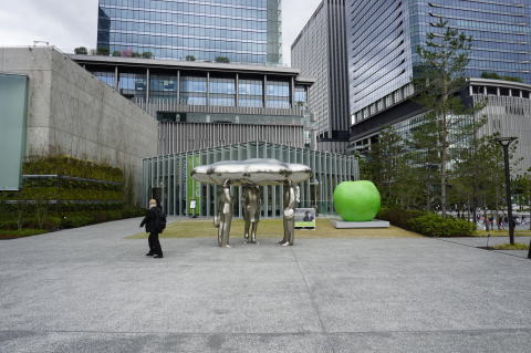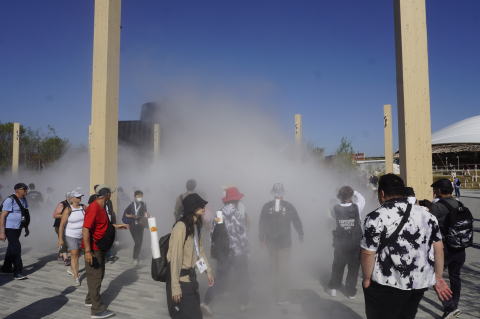 うだるような暑さの中、人口滝が流れている。